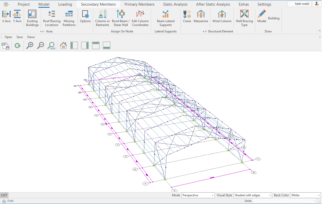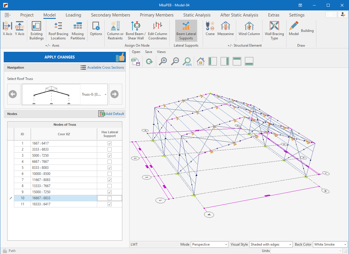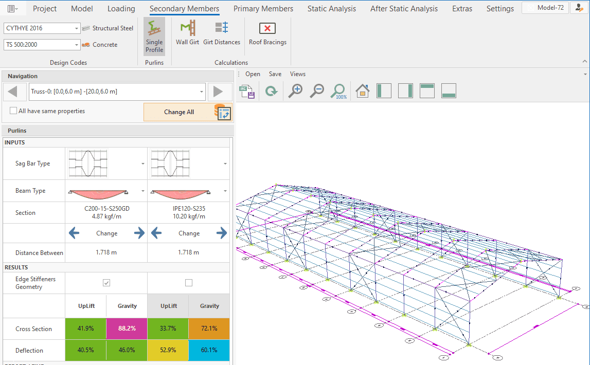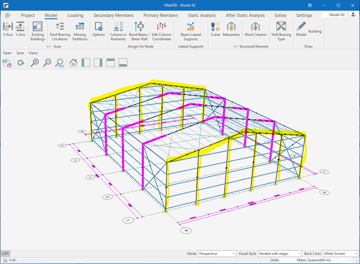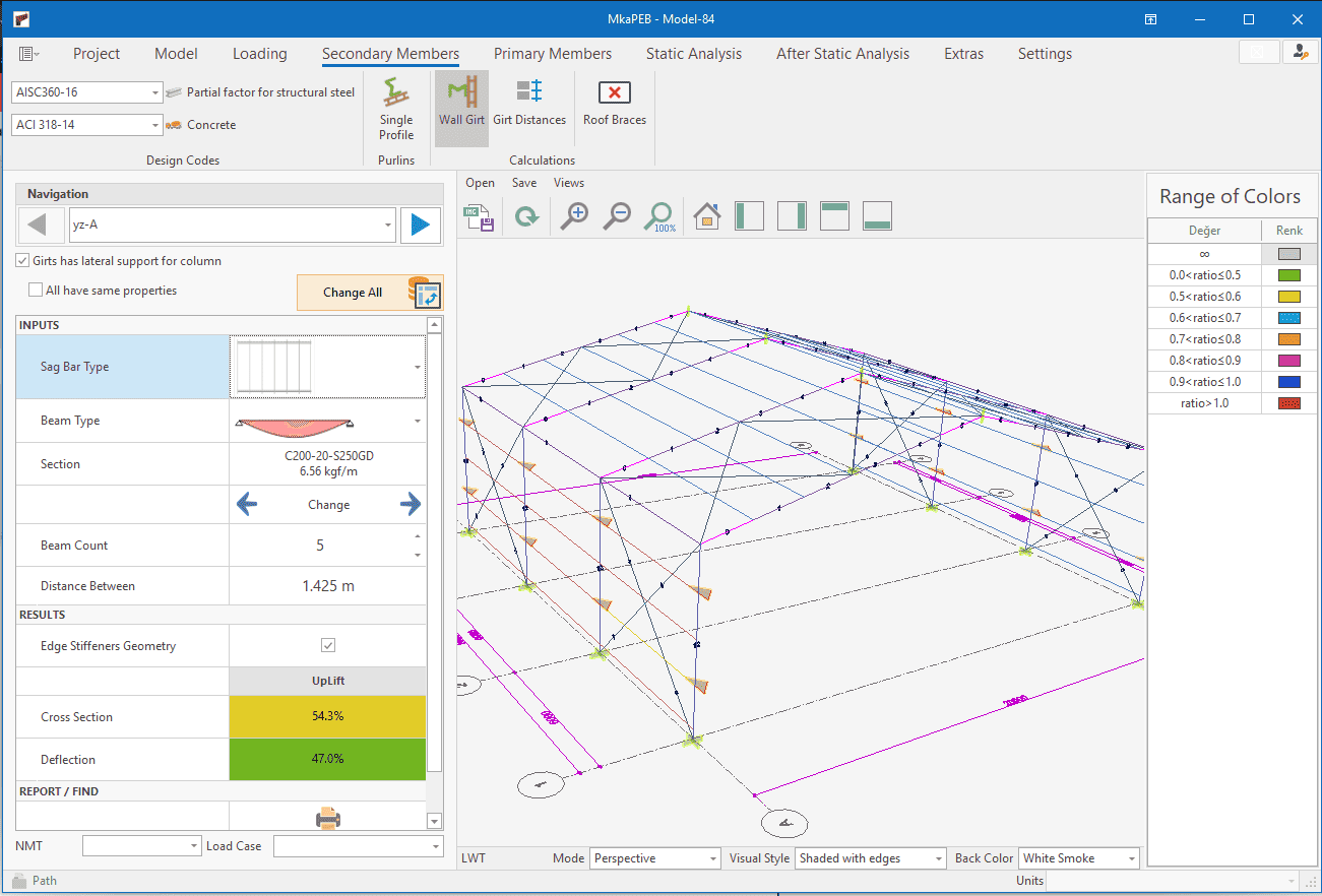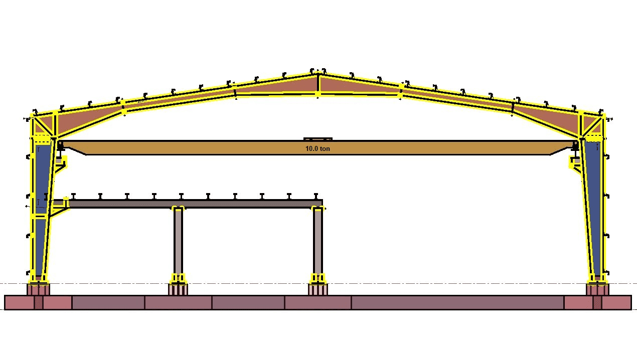 The single-storey steel warehouse structure has wind columns on the front and rear facades. And this axis receives less snow and wind load than the intermediate axis. Therefore, savings can be made by using smaller sections in the axis. Today, many PEB manufacturers have adopted this method. This feature has been added to MkaPEB so that you have no difficulty in competing with these companies.