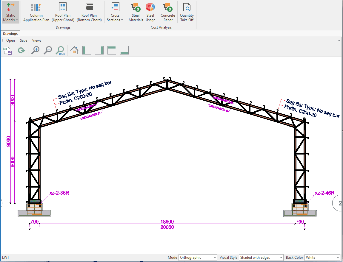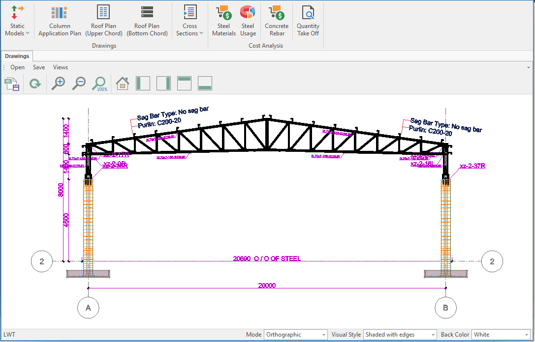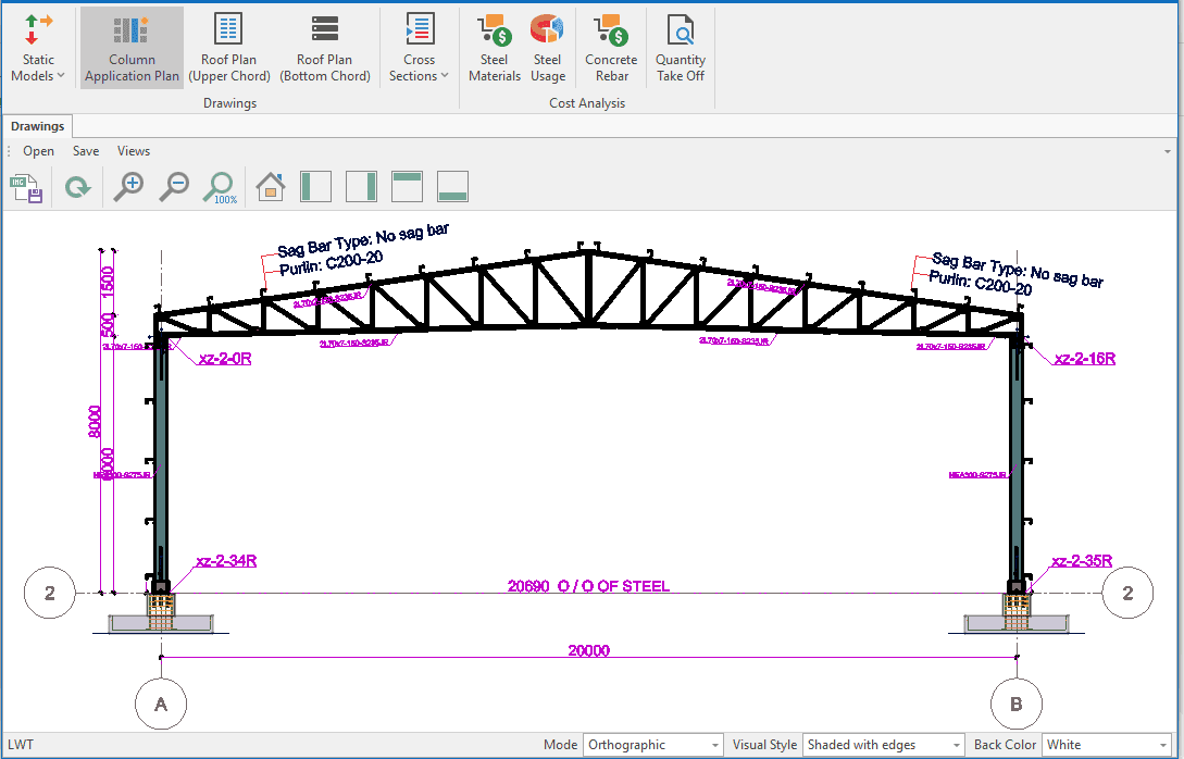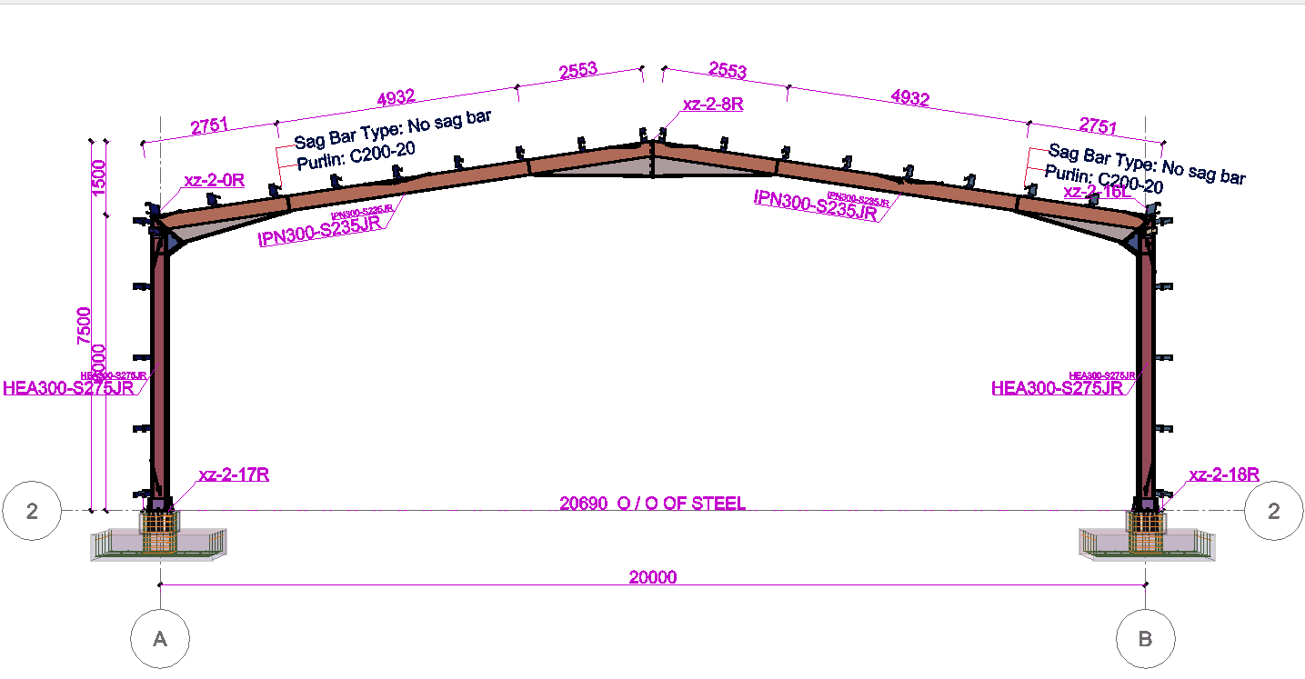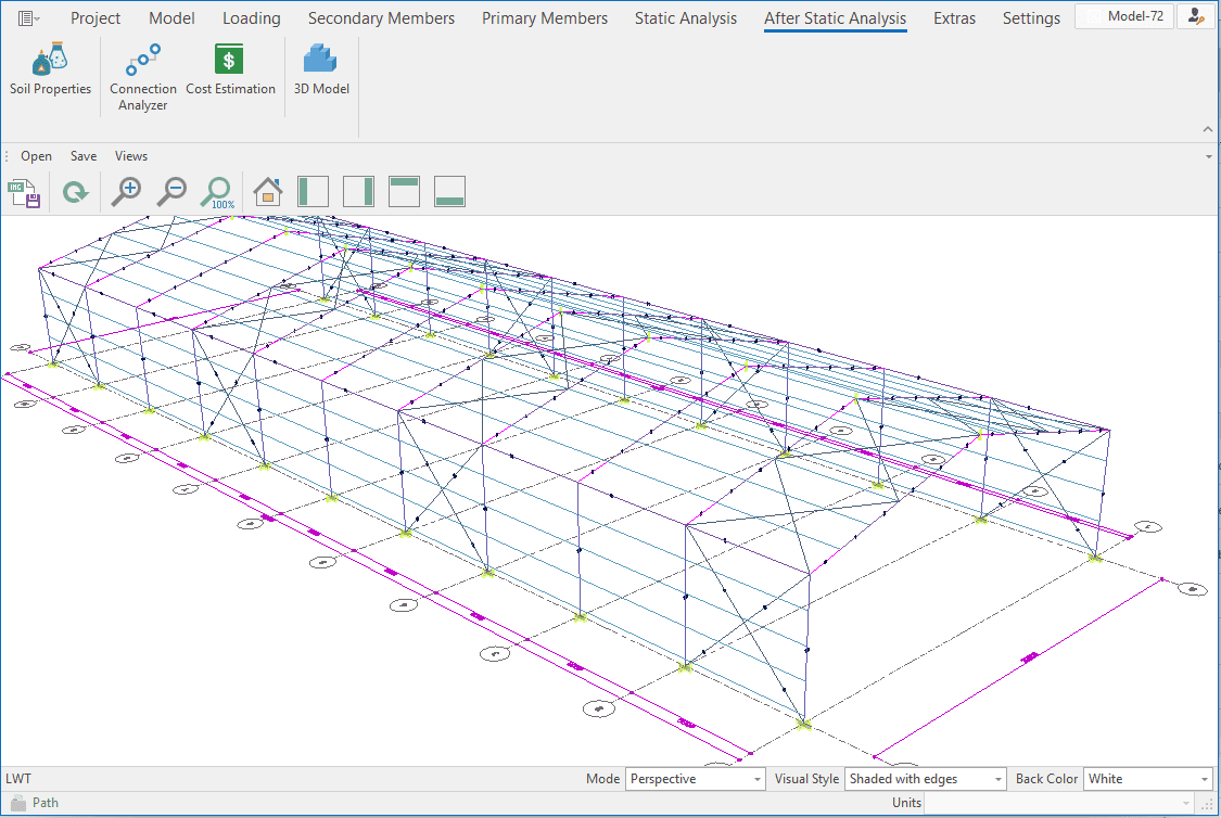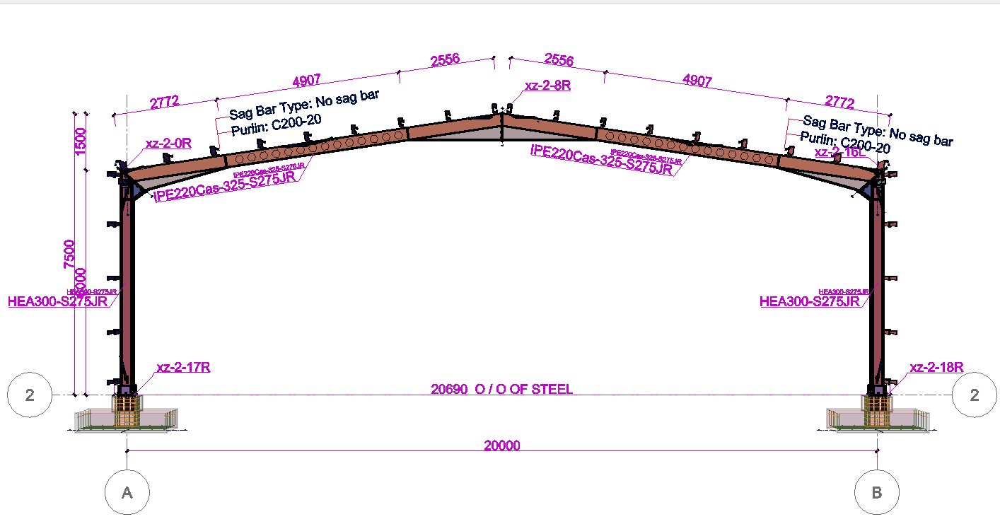 The single-storey steel warehouse structure has wind columns on the front and rear facades. And this axis receives less snow and wind load than the intermediate axis. Therefore, savings can be made by using smaller sections in the axis. Today, many PEB manufacturers have adopted this method. This feature has been added to MkaPEB so that you have no difficulty in competing with these companies.