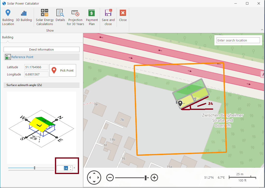 Step-1: Therefore, first of all, we tick the option there are solar panels on the roof and the we select the location of the building on the world from the map.