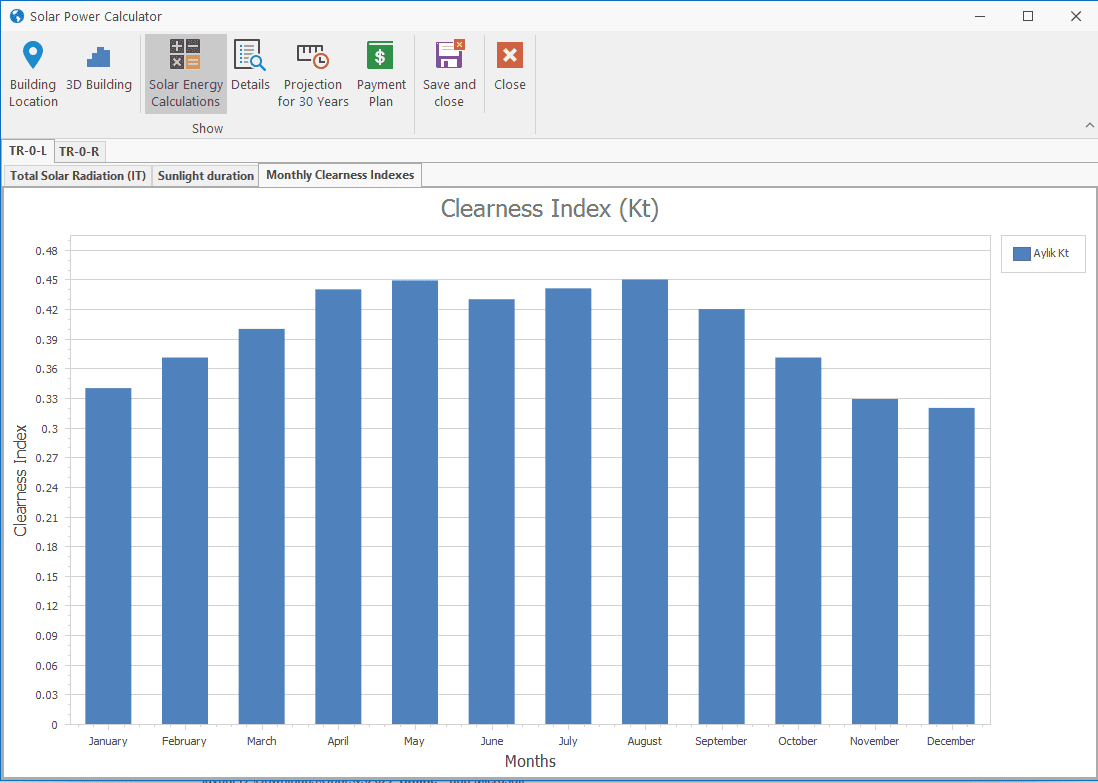 Step-5: For solar radiation calculations, sunlight duration and air clearness index taken from NASA are very important parameters. clearness index data are monthly values given for every point in the world, taking into account the average values of the last 30 years. These topics will be very familiar to energy engineers.